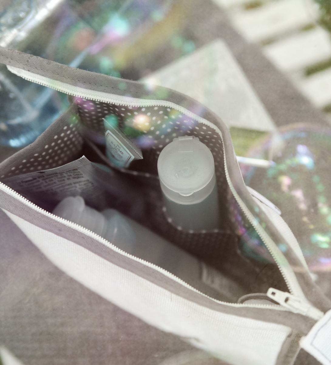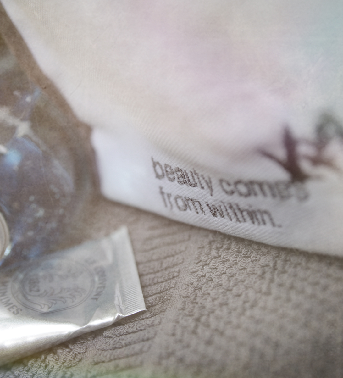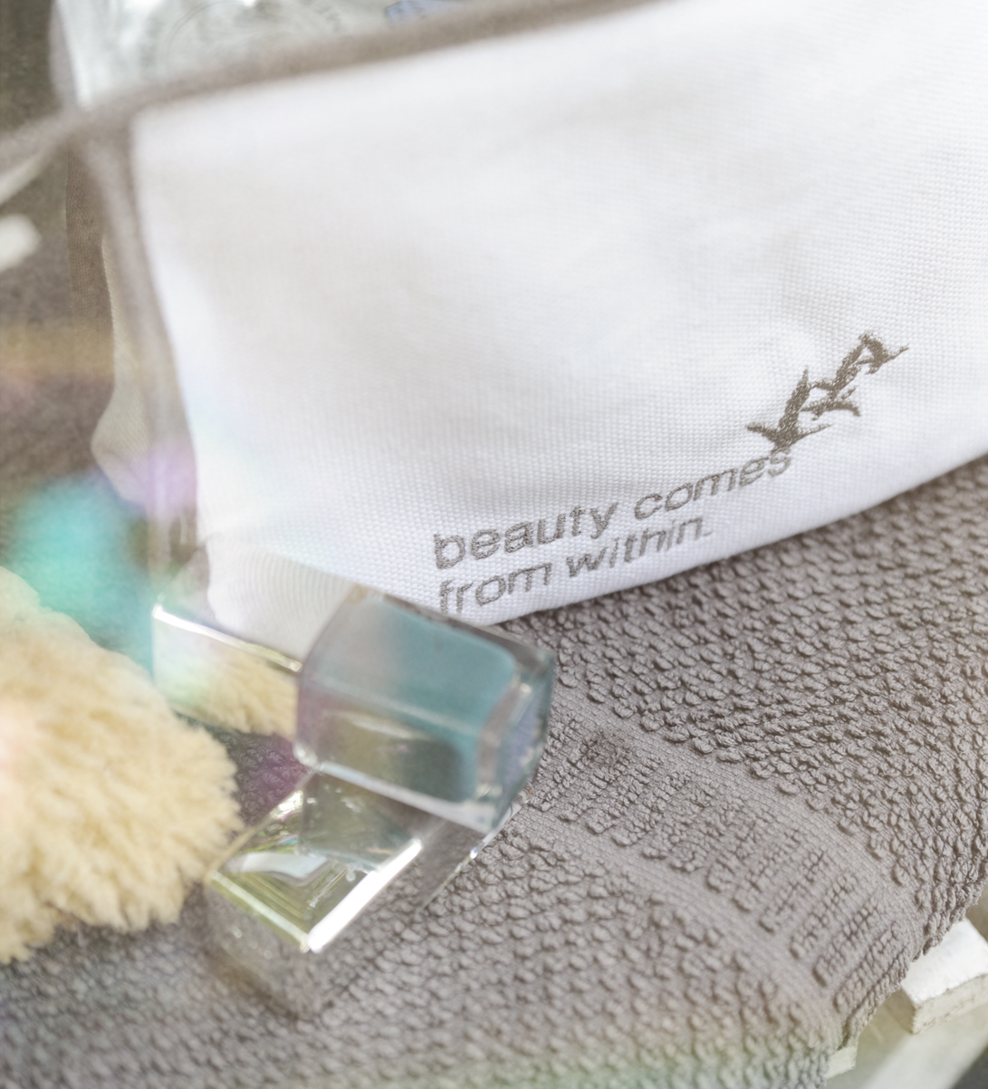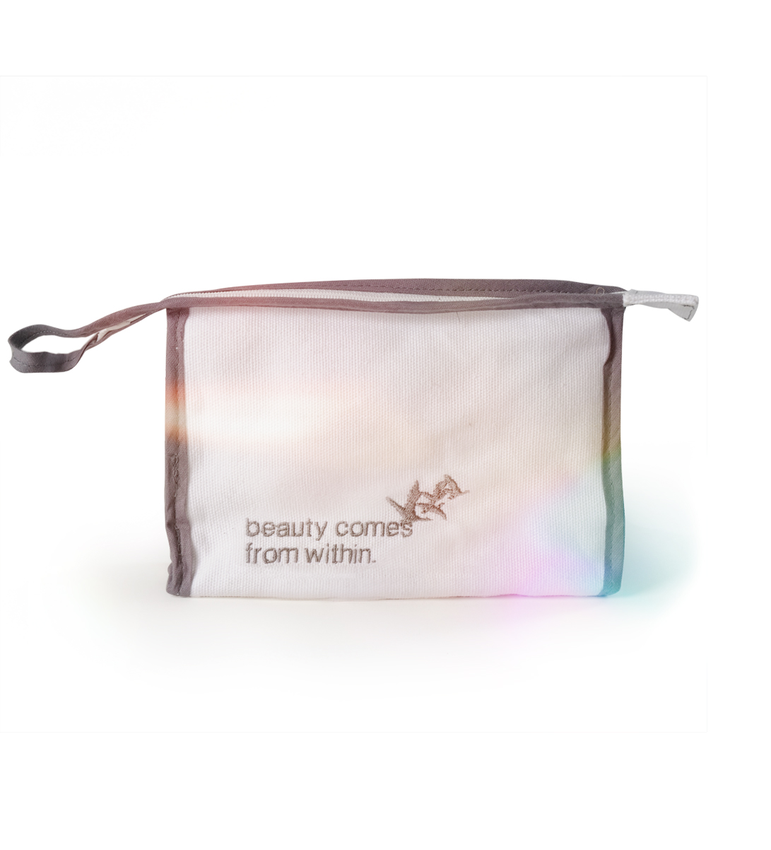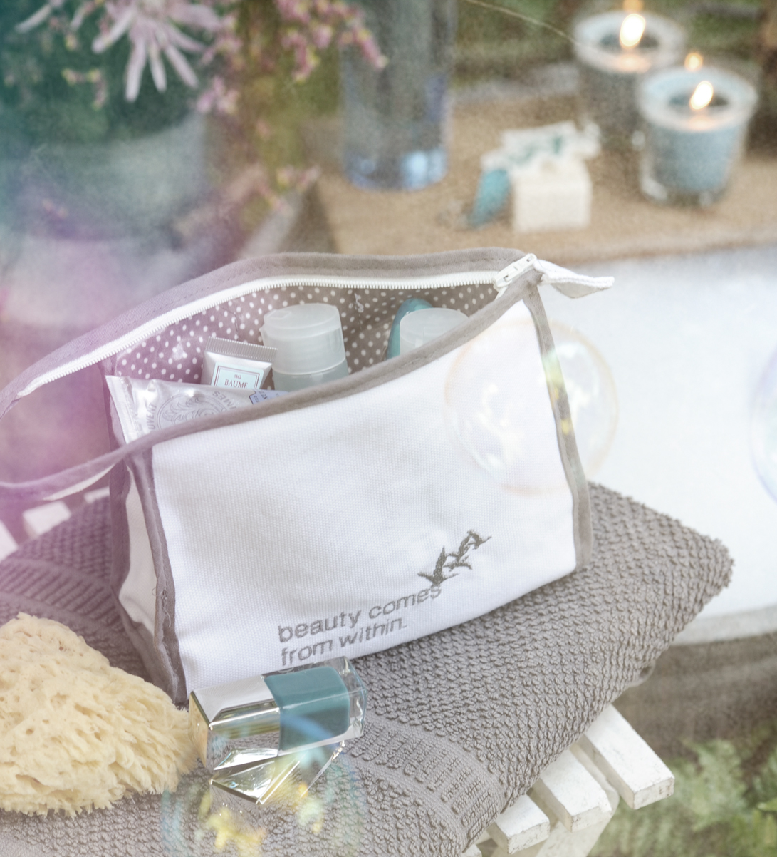 Kulturtasche mit Stickerei des Sprichworts: „BEAUTY COMES FROM WITHIN.“ Das weiße Beautycase hat einen Reißverschluss, mehrere Fächer im Innenraum und ist von Innen abwaschbar. Die graue Stickerei ist auch mit den Kranichen verziert. Die Größe beträgt ca. 18 x 15 cm.