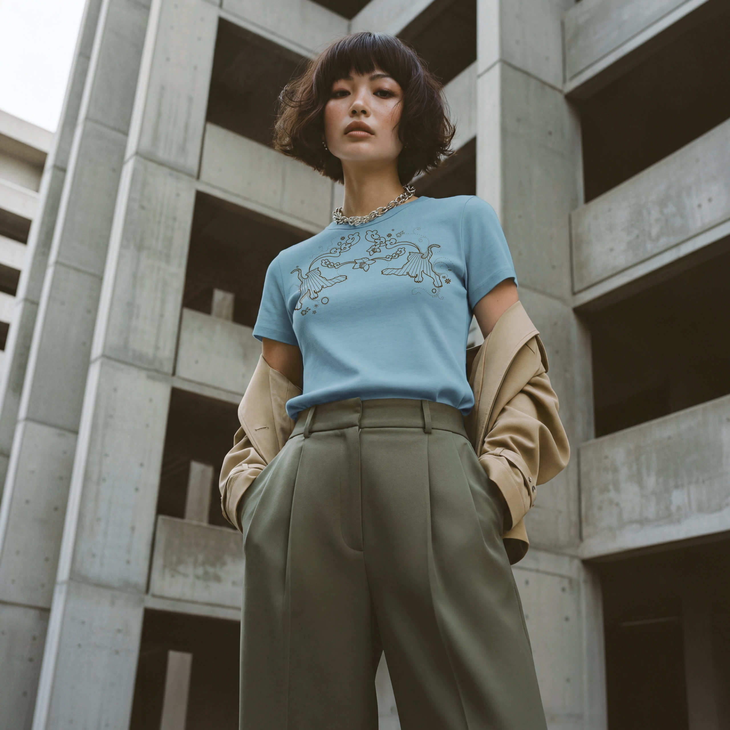 Kombiniere das Tiger-Shirt mit einer beigen Leinenhose, fließenden Palazzo-Pants oder einem hellen Blazer für einen mühelos eleganten Street-Look mit künstlerischer Note.
